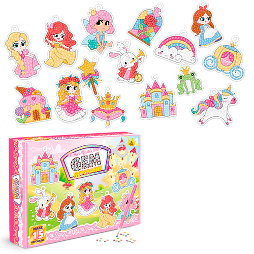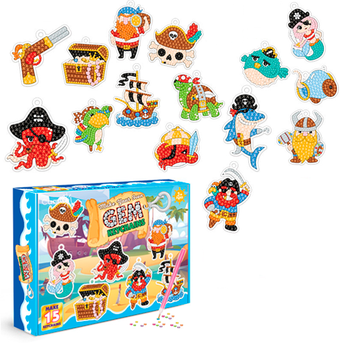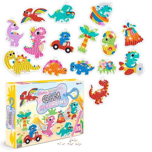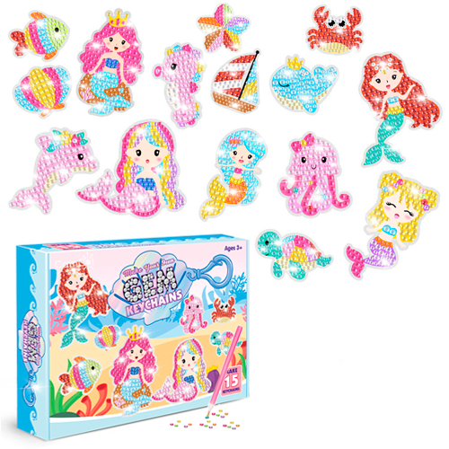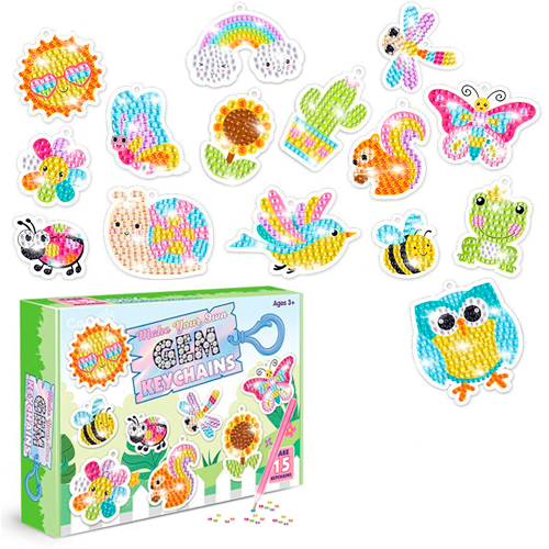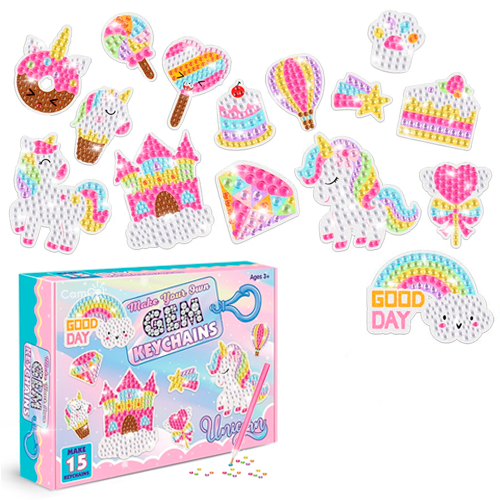- Contém: Chaveiros; diamantes; aplicador; colinha; potinho