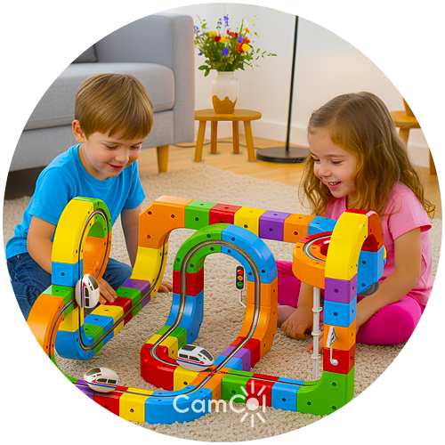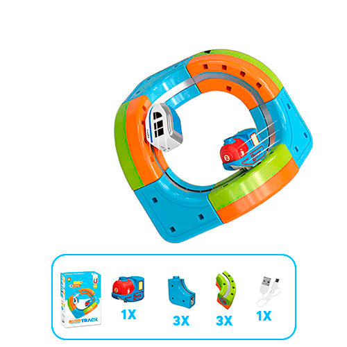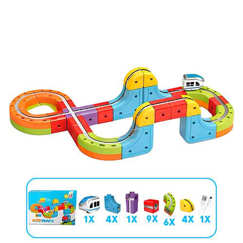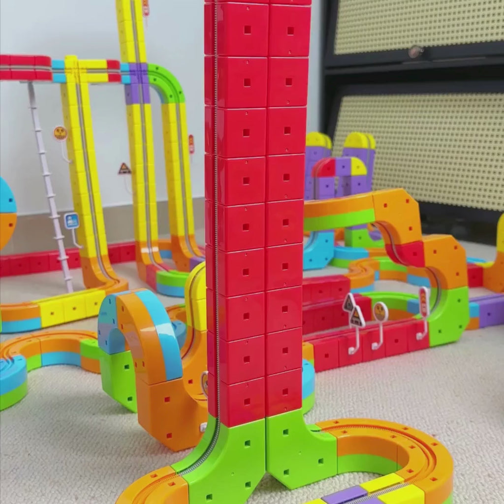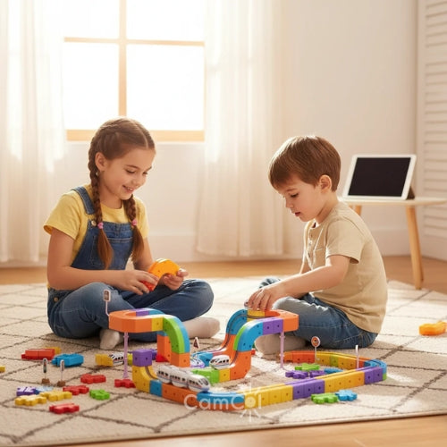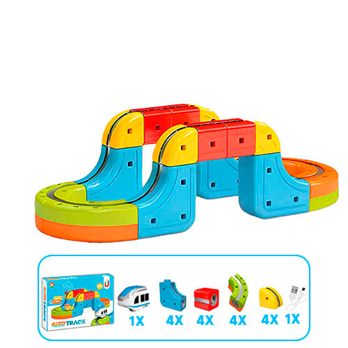 Com o Magic Track, o tempo longe das telas se transforma em criatividade. As crianças encaixam os blocos e criam pistas cheias de curvas, rampas e túneis, explorando lógica, coordenação e imaginação.